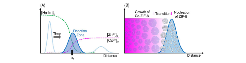 作者报道了一种基于反应-扩散框架(RDF)的简易方法,在室温下使高浓度2-甲基咪唑(HmIm)溶液扩散到含Zn²⁺和/或Co²⁺的琼脂凝胶基质中,制备出ZIF-8、ZIF-67及Co-Zn混合金属固溶体ZIF。所得晶体尺寸沿反应管呈100 nm-55 μm梯度分布,Co掺杂ZIF-8在可见光下无需过氧化氢即可高效光降解亚甲基蓝。