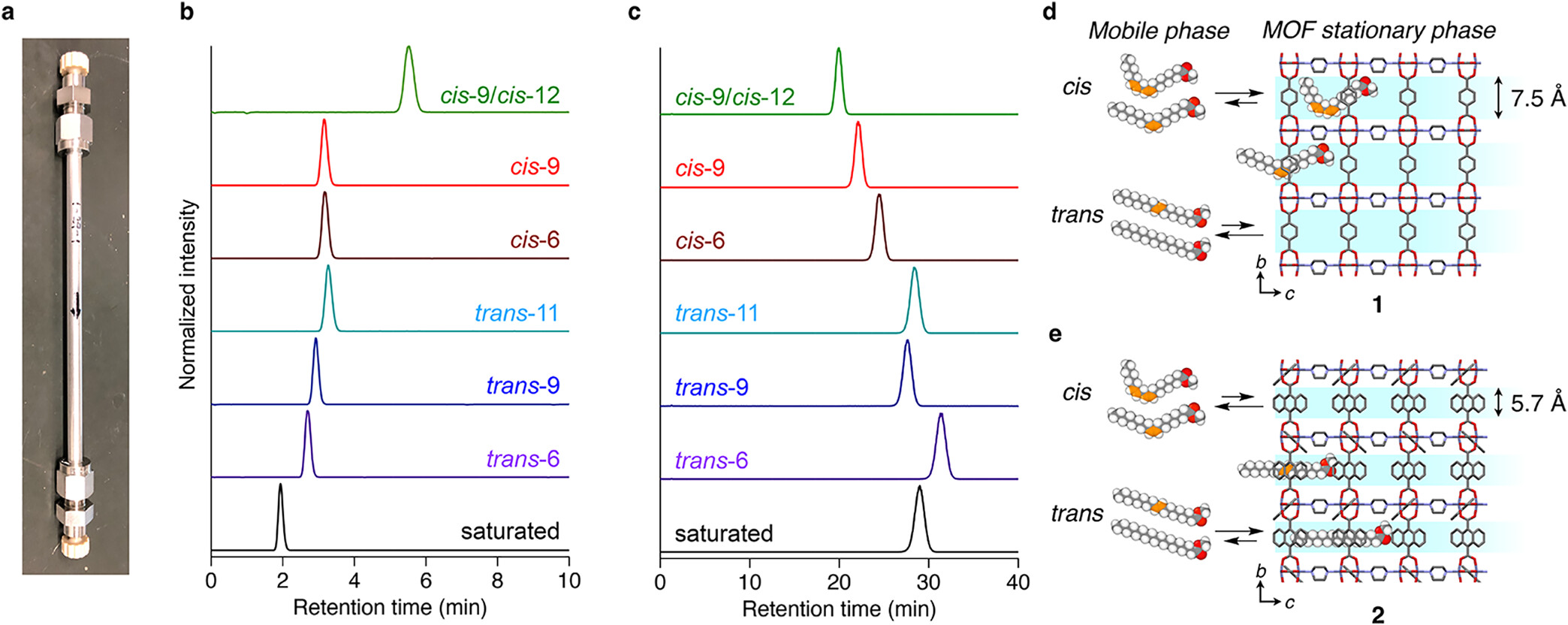 1) 首次将两种亚纳米通道MOF用作LC固定相,通过纳米孔插入识别机制,实现FAMEs的E/Z异构和C=C位置异构的高分辨率分离。
