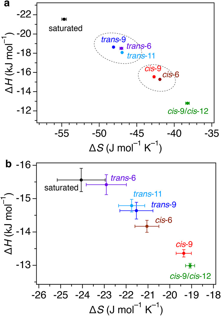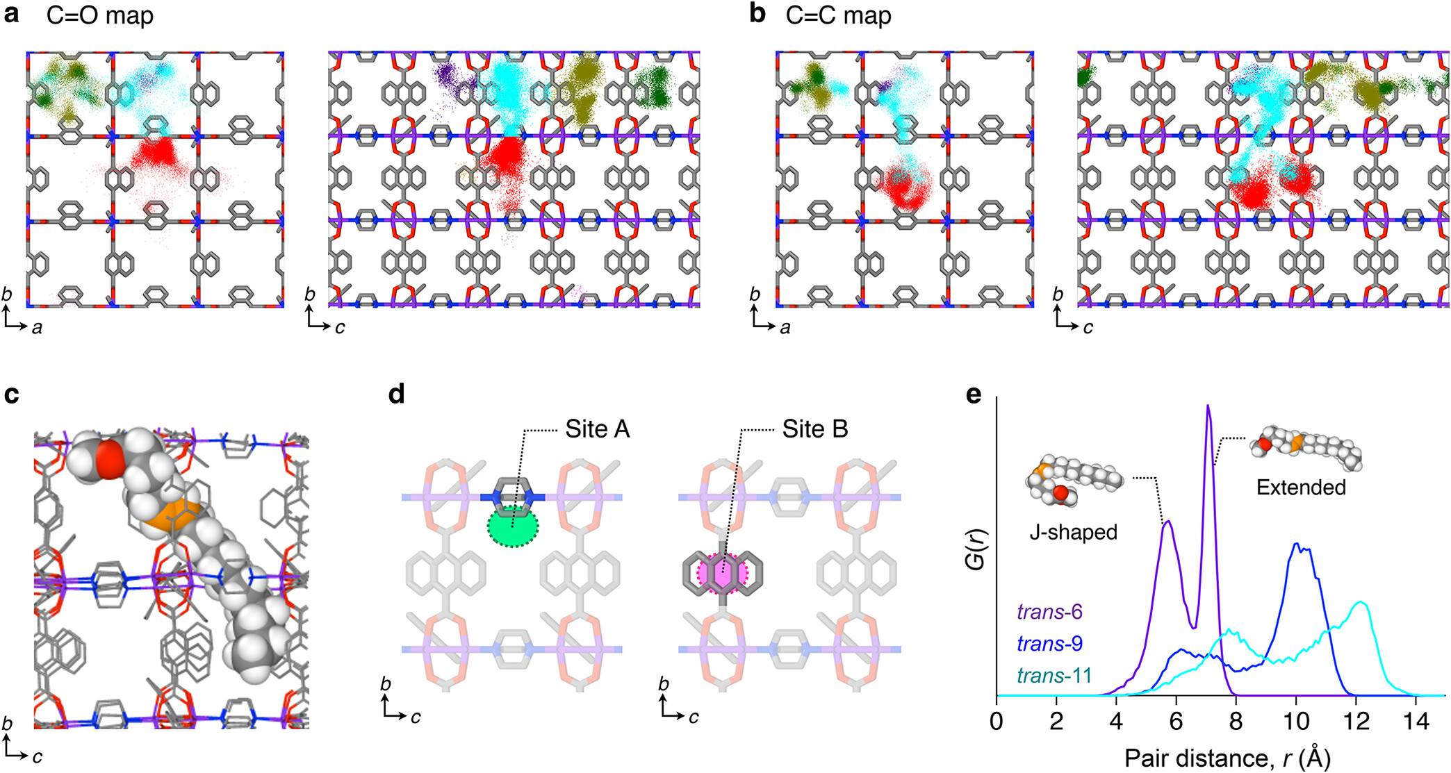 2) 多位点相互作用机制:分子动力学模拟显示,FAMEs的羰基(C=O)与MOF 2中ted配体的正电位点(Site A)形成静电作用,trans-6的C=C可同时与ndc配体的π体系(Site B)作用,而trans-9和trans-11因烷基链长度差异无法形成双位点作用,实现位置异构识别。