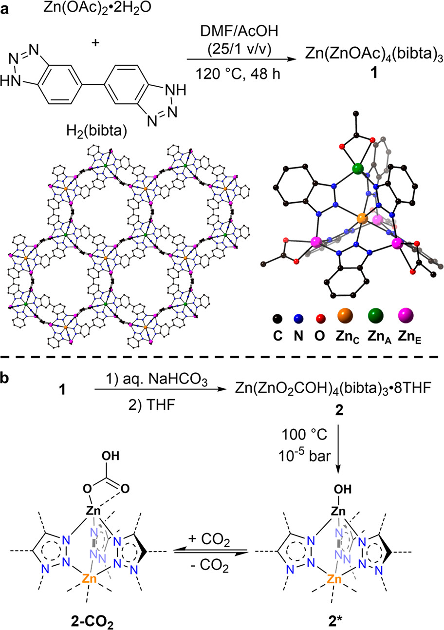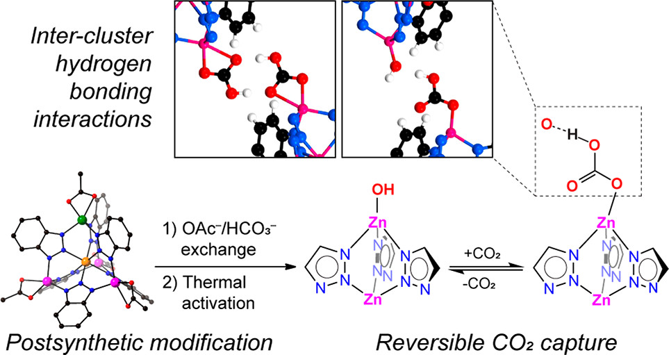 通过温和的配体交换及热活化工艺,在锌苯并三唑基金属有机框架(MOF)中构建出类碳酸酐酶活性位点的亲核Zn−OH基团,所得材料[Zn(ZnOH)₄(bibta)₃](2*)具有优异的痕量CO₂捕获性能,可在温和温度下再生,团簇间氢键作用强化了CO₂固定机制。