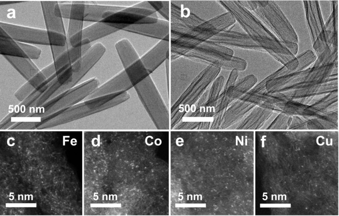 1. 透射电子显微镜(TEM)和球差校正高角环形暗场扫描透射电子显微镜(HAADF-STEM):TEM显示M₁-N-C为棒状,Ni₁-N-C直径200nm,无明显金属纳米颗粒;HAADF-STEM显示金属原子在碳载体中原子级分散。揭示催化剂为单原子分散结构。