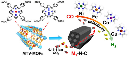 2. 本文创新:以同构卟啉基MTV-MOFs为前驱体,合成了具有相似微环境和载体的系列M₁-N-C催化剂,排除载体等干扰;开发的Ni₁-N-C催化剂可直接高效催化低浓度CO₂还原,解决实际应用中原料问题。