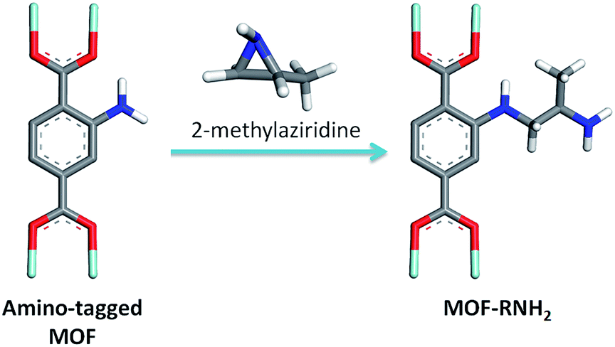 2. 合成后修饰:氨基MOF与2-甲基氮丙啶在CHCl₃中45℃反应6h,经洗涤干燥得MOF-NH-RNH₂,修饰率8.2%-36%。