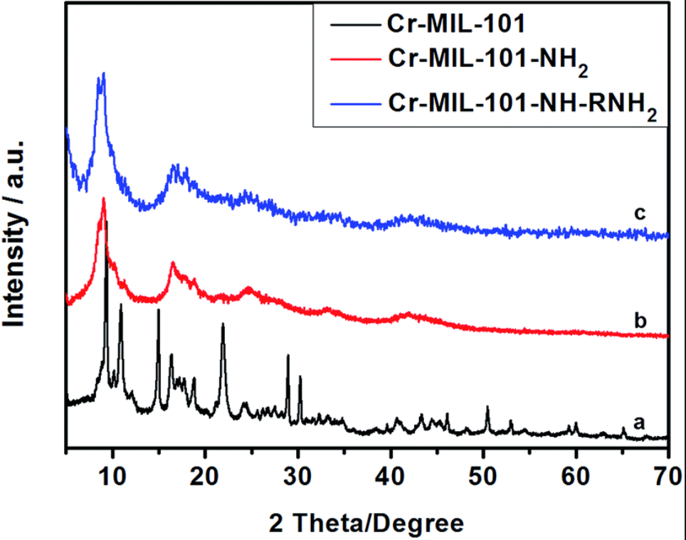 2. 氮气吸附:Cr-MIL-101-NH₂(1989m²/g)→修饰后1175m²/g;UiO-66-NH₂(1263m²/g)→修饰后336m²/g。