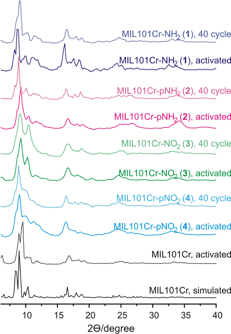 通过合成后修饰制备了四种硝基/氨基功能化MIL-101Cr材料,评估其水吸附容量与40次循环稳定性;全氨基(1)和部分氨基(2)功能化材料表现出最优水吸附性能(约1.0g/g)及结构稳定性,硝基功能化材料则出现比表面积下降,为热转化应用提供优质吸附剂选择。