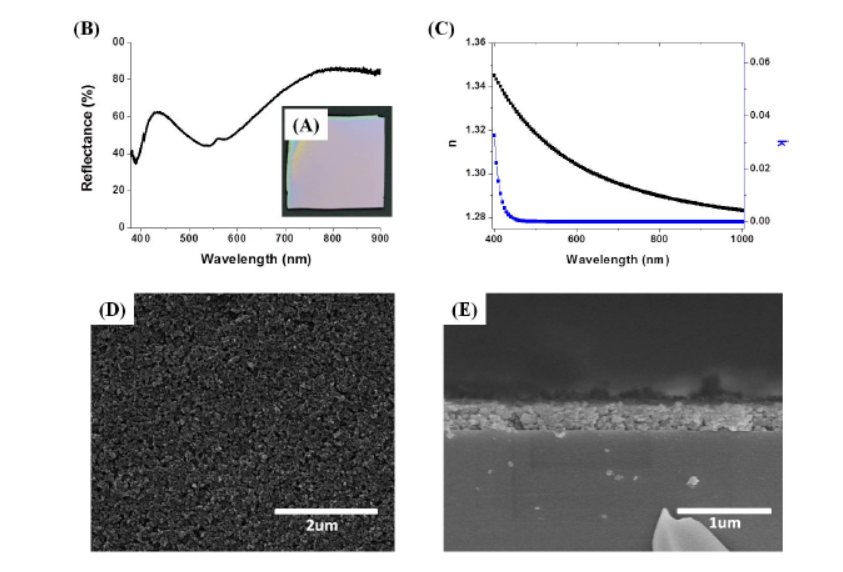 2. 光学性能测试:椭圆偏振仪测得750 nm处原始薄膜n=1.292,C3修饰后1.371,C5修饰后1.424,C7修饰后1.299;反射峰从433 nm红移至498 nm(C5),反射率从70%降至30%。