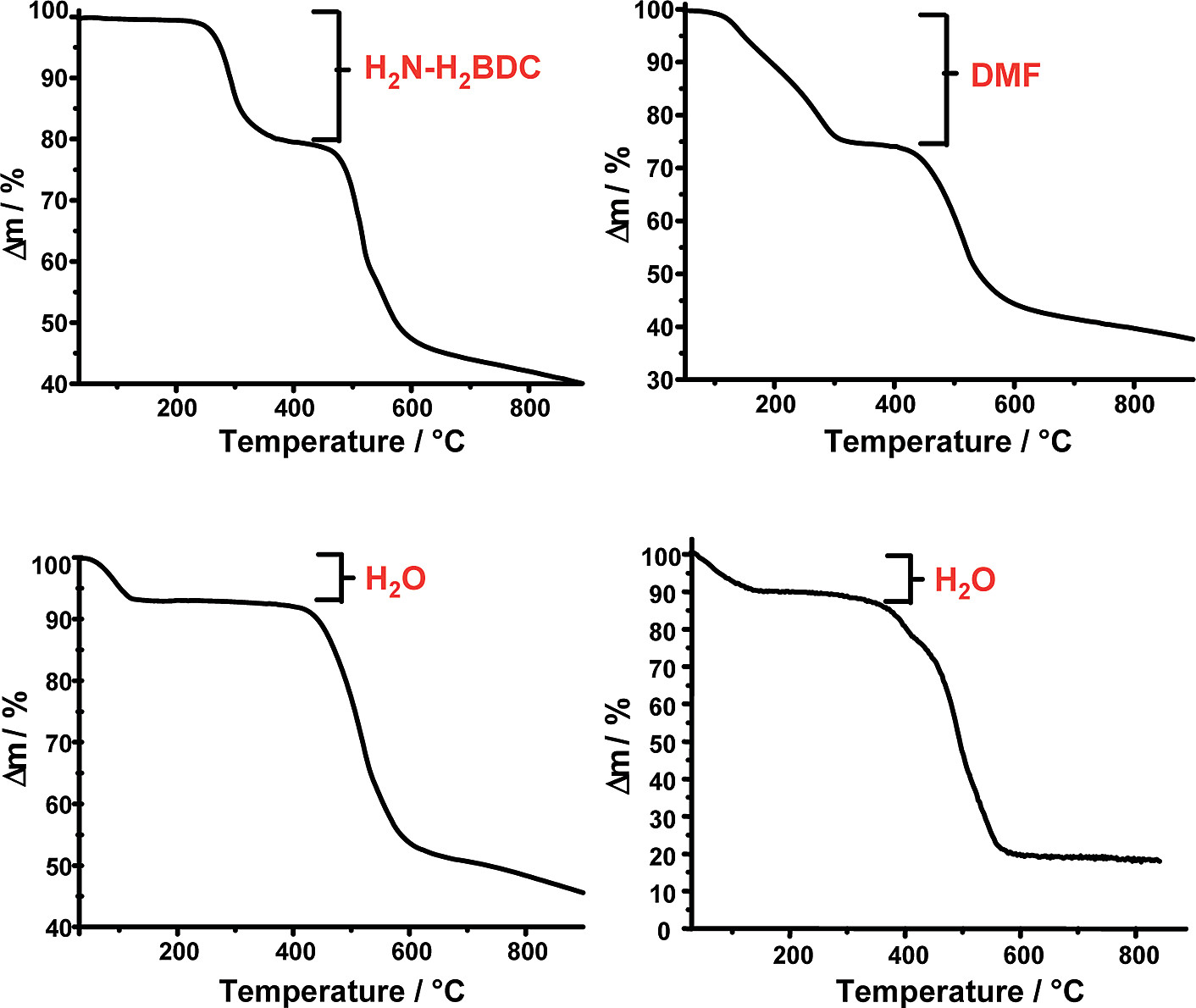 2. 热性能测试:TG曲线显示两步失重,as相220℃释放游离配体,四种材料框架均稳定至400℃左右。