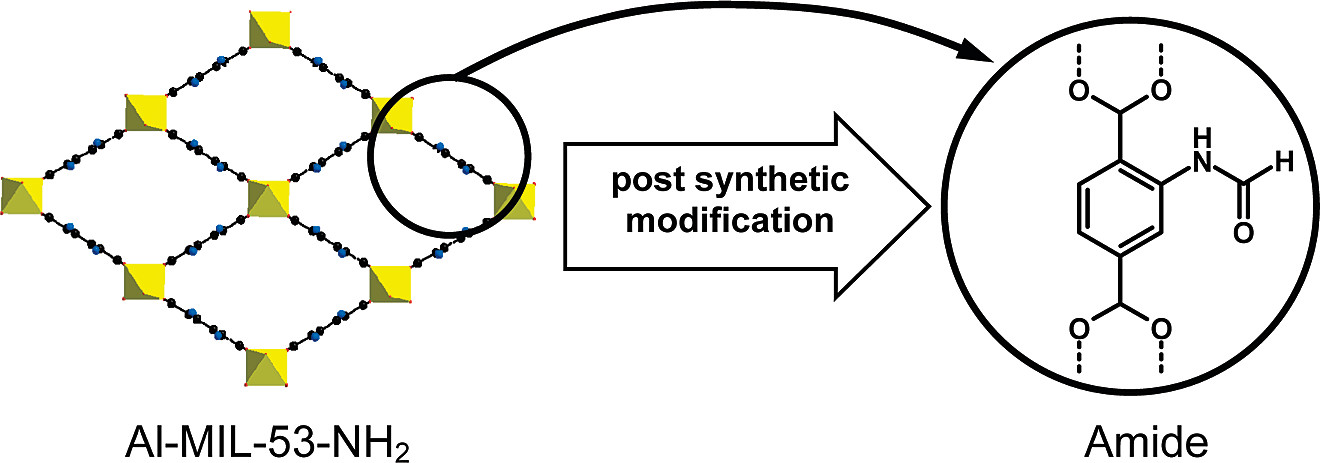 通过水热法合成了氨基功能化铝基MIL-53材料(MIL-53-NH₂),经两步活化(DMF交换、热脱附)得到多孔相。利用甲酸对其进行后合成修饰,形成甲酰胺功能化产物(MIL-53-NHCHO)。通过多种表征证实材料具有MIL-53特征呼吸行为,后修饰成功且未产生副产物。