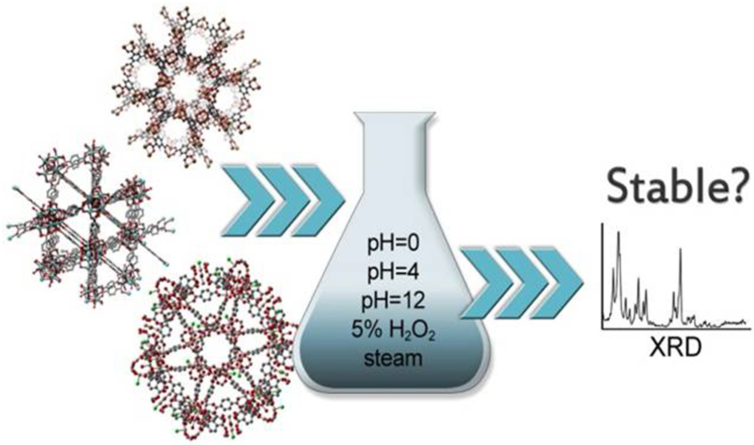 2. 稳定性测试:将MOF分别暴露于水热(200℃蒸汽5h)、pH=0/4/12溶液、5wt% H₂O₂、空气和水,分别培养3天和2个月。