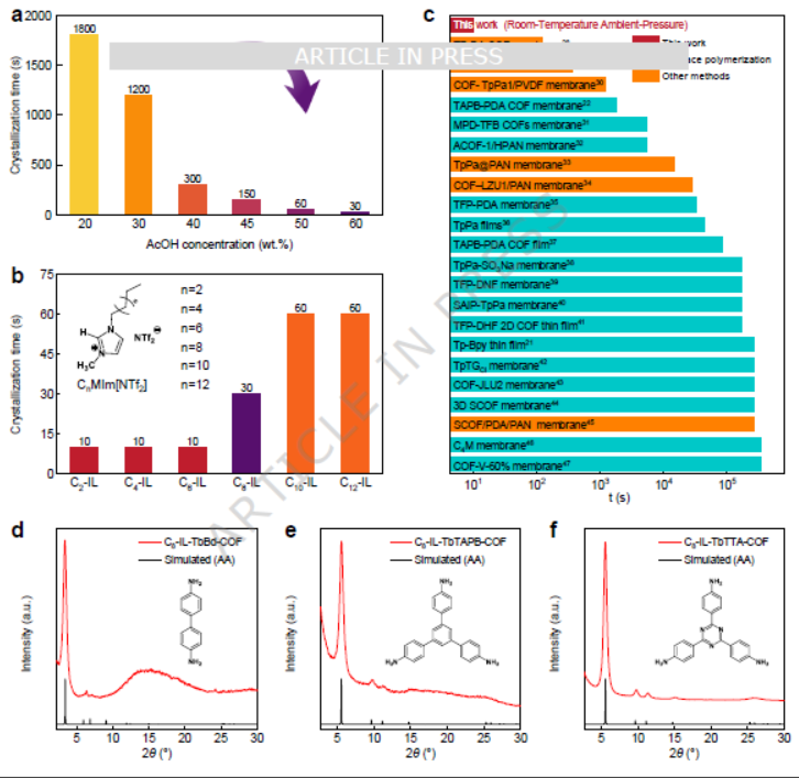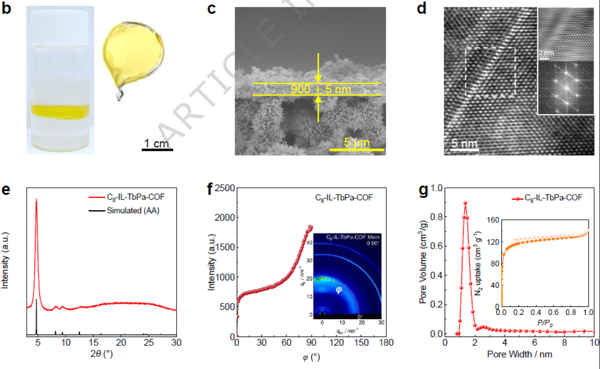 3) 该方法具有普适性,成功制备出C₈-IL-TbBd-COF、C₈-IL-TbTAPB-COF等多种高结晶度COF膜,拓展了COF膜的制备范围。