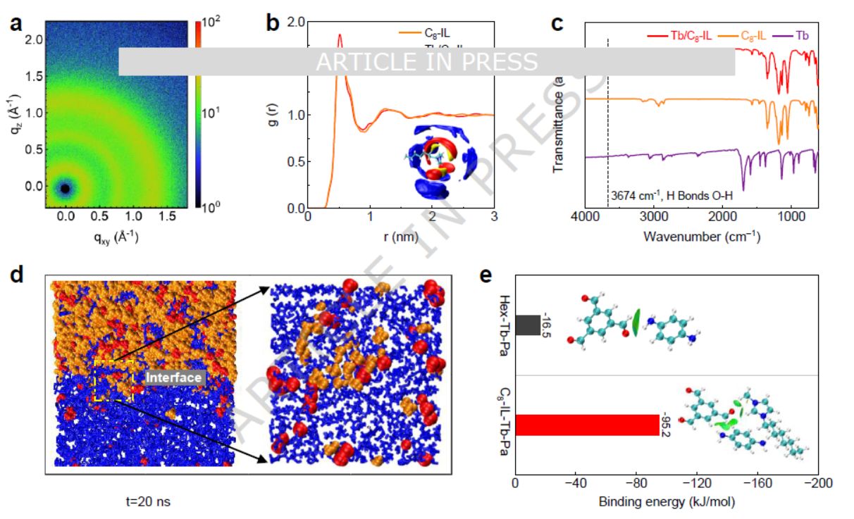 1) 单体预排列效应:离子液体通过离子-氢键网络形成有序结构,Tb单体借助强氢键作用嵌入该网络实现有序预排列,降低结晶能垒。