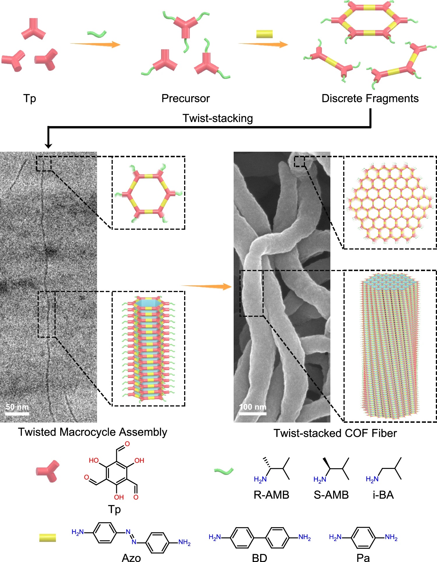 2)发现COF的径向生长模式,通过大环纳米管中间体继承扭转结构,实现纤维直径(30-120 nm)和扭转角度的可控调节。