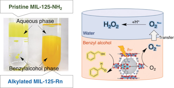 本文报道将光活性MOF材料MIL-125-NH₂应用于苯甲醇/水双相体系,实现过氧化氢(H₂O₂)与苯甲醛的光催化制备及自发分离。MOF疏水改性后可与水相分离,提升光催化效率,适配低pH等特殊水相体系,且能通过缩减水相体积获得高浓度H₂O₂。