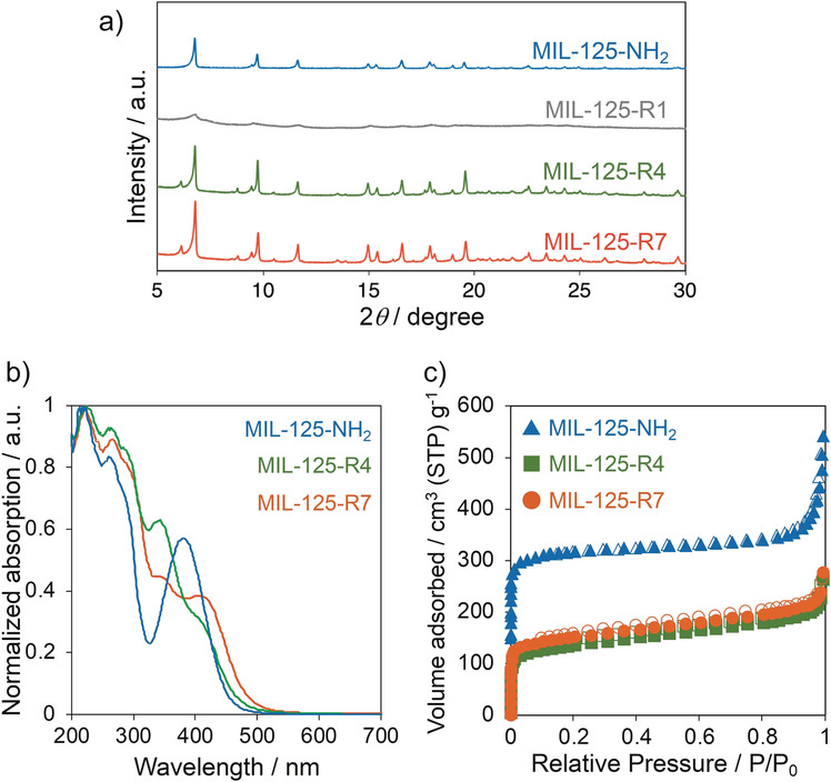 2. UV/Vis:MIL-125-NH₂在390nm有LCCT吸收,R4、R7该峰减弱,350nm出现新峰,可见光区仍有主要吸收。