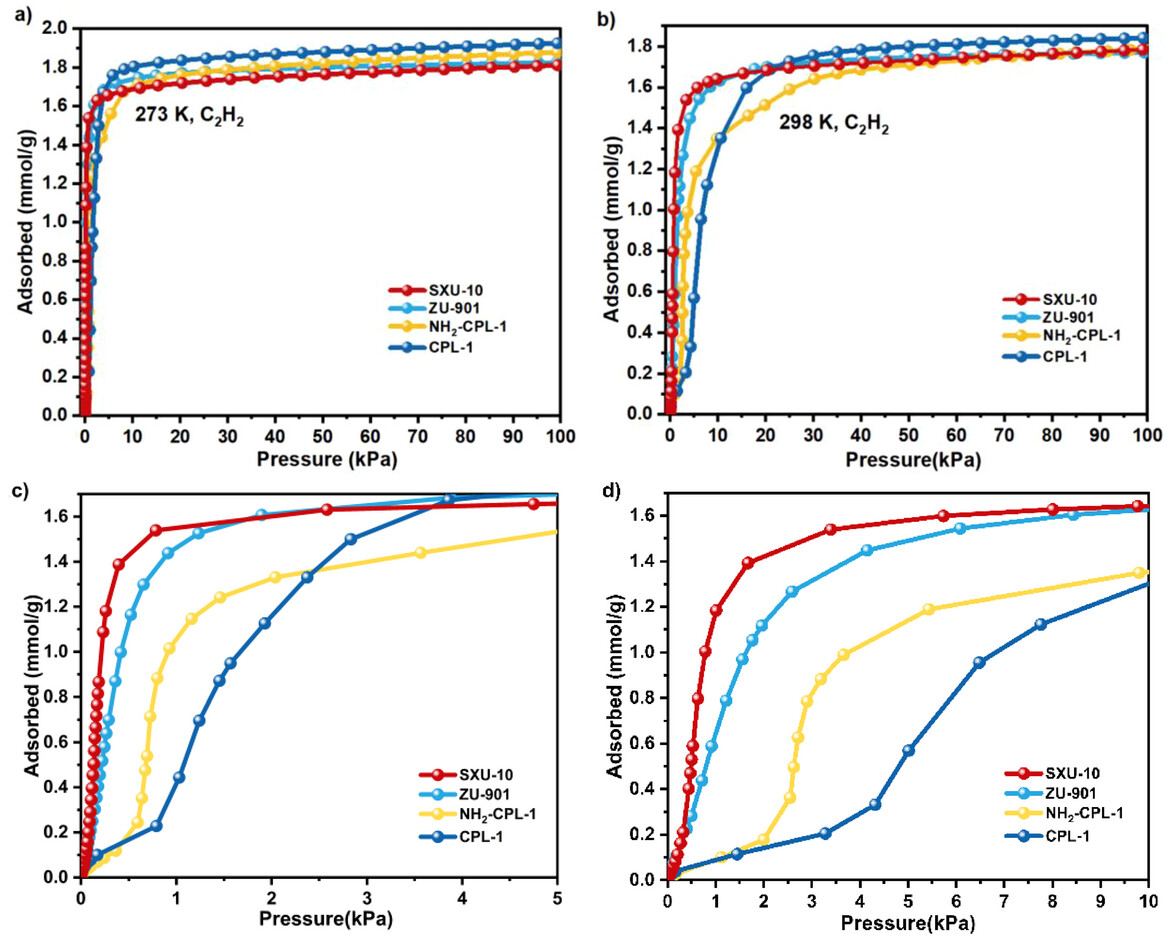 1) 静态吸附:298 K下,SXU-10在1 kPa时C₂H₂吸附量达1.18 mmol g⁻¹,100 kPa时为1.79 mmol g⁻¹,填充密度分别为483.9 mg cm⁻³和733.97 mg cm⁻³,远超Ni-HOF、UTSA-200等现有材料。