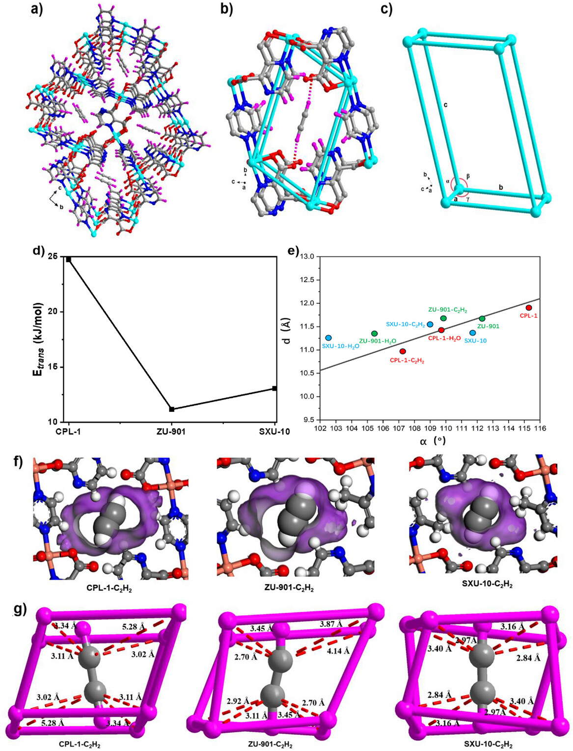 2) 首次合成双甲基功能化的SXU-10,揭示了取代基诱导的框架柔性约束与主客体形状适配协同增强低压力痕量C₂H₂吸附的新机制,通过原位单晶X射线衍射直接可视化吸附过程。