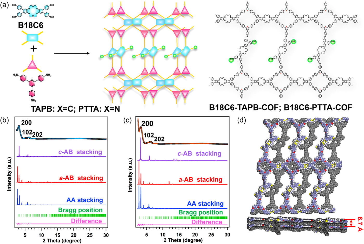 采用溶剂热法,将四甲醛单体(B18C6)分别与三胺单体(TAPB/PTTA)在120°C下于混合溶剂中反应72 h,分别得到B18C6-TAPB-COF(产率85%)与B18C6-PTTA-COF(产率83%),通过席夫碱缩合反应形成稳定骨架并保留悬挂醛基。: