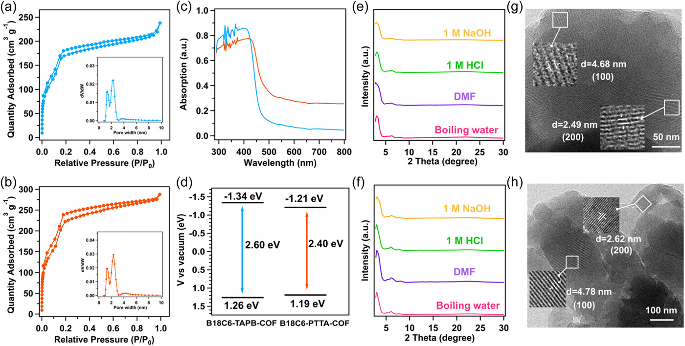 3)N₂吸附:B18C6-TAPB-COF与B18C6-PTTA-COF的BET比表面积分别为549.65 m² g⁻¹和779.29 m² g⁻¹,NLDFT计算显示孔径集中在1.26-2.34 nm,为微孔-介孔复合结构。