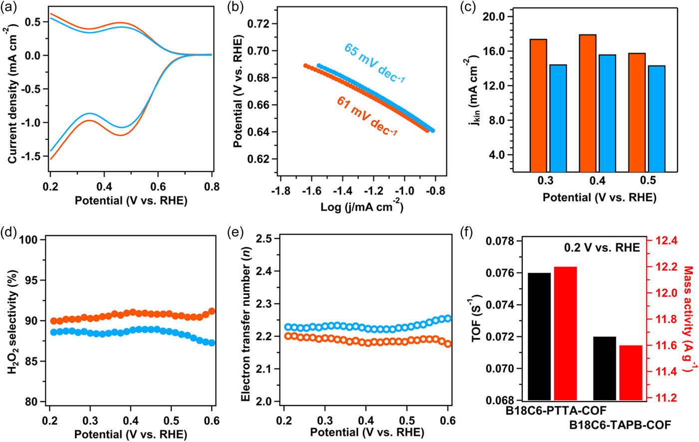 1)电催化2e⁻ ORR性能:在0.1 M KOH电解液中,B18C6-PTTA-COF的起始电位为0.72 V vs. RHE,半波电位0.56 V,Tafel斜率低至61 mV dec⁻¹;在0.2-0.6 V电位区间H₂O₂选择性保持90%-91%,电子转移数n=2.17-2.20,接近理想2e⁻转移路径。
