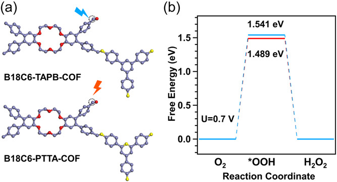 1)DFT计算表明,悬挂醛基中的碳原子为主要活性位点,其负电荷分布有利于OOH*中间体吸附;B18C6-PTTA-COF中的吡啶N原子通过电子效应增强OOH*结合能力,自由能变化(1.489 eV)低于B18C6-TAPB-COF(1.541 eV),加速催化动力学。