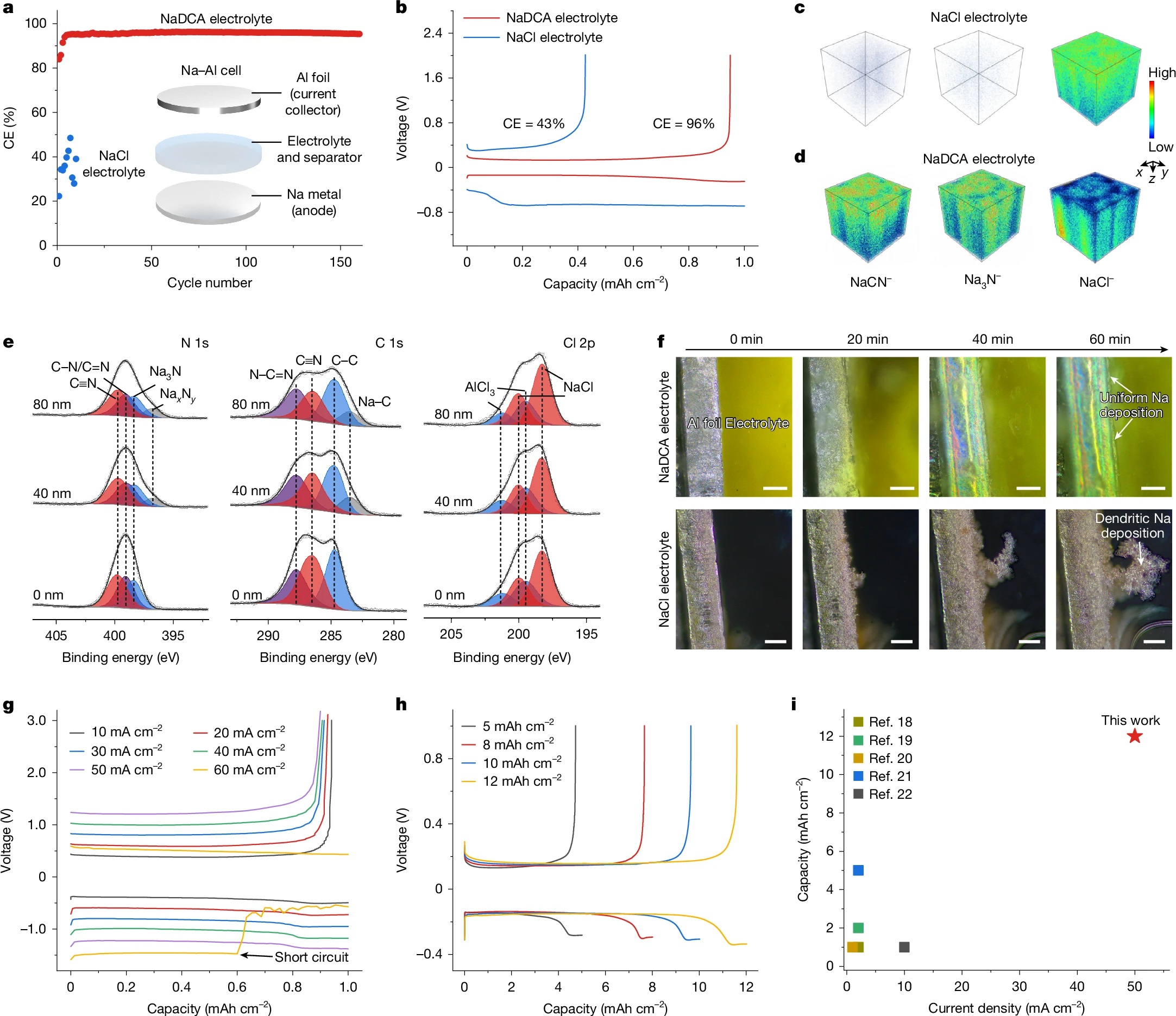 3)钠沉积行为:TOF-SIMS与XPS显示,电解液形成含NaCN、Na₃N的富氮SEI层,促进Na⁺传输,实现均匀无枝晶沉积,临界电流密度达50 mA cm⁻²。