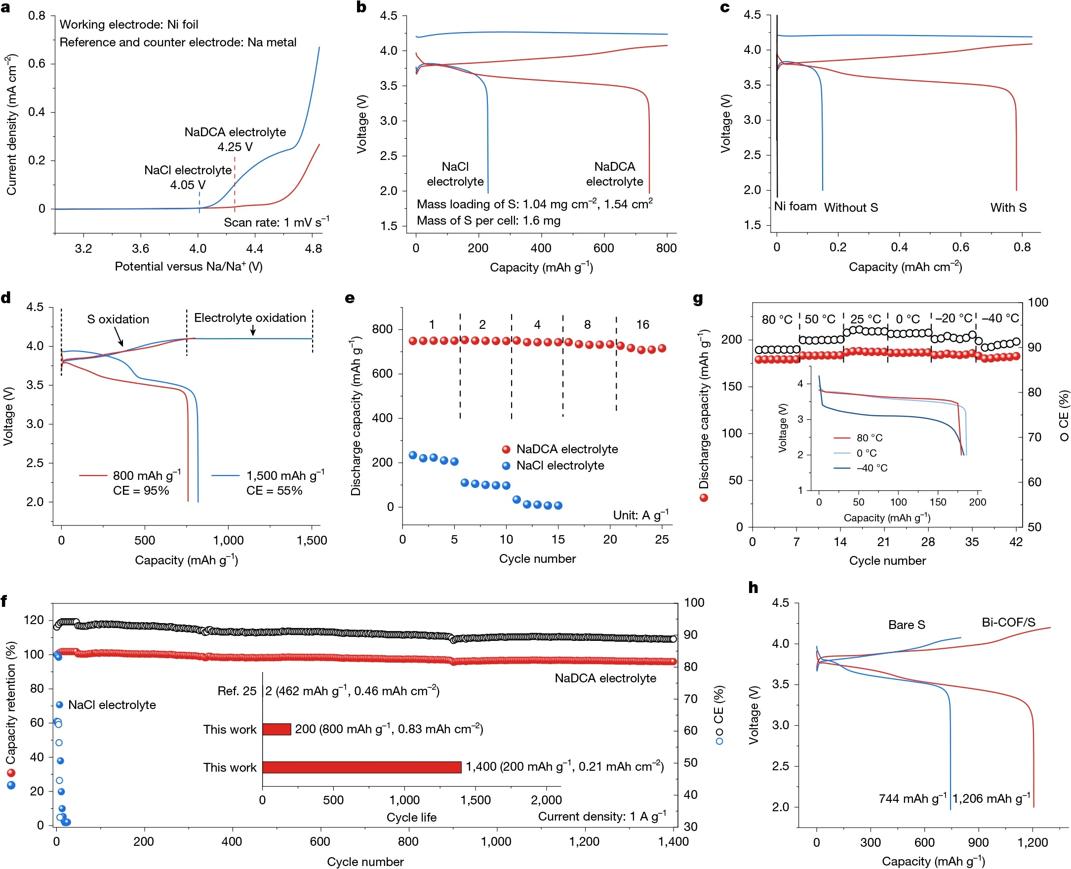 2. 氯铝酸盐电解液与DCA⁻阴离子的协同设计,解决了高价态硫转化与Na沉积的兼容性问题,实现96%库仑效率与1400次长循环,为无负极电池界面优化提供新范式。