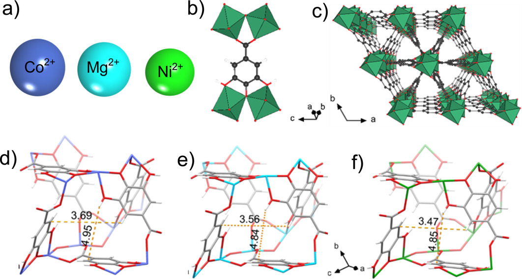 本文报道了Ni、Mg、Co基等结构没食子酸金属有机框架(M-gallate),其孔径可通过金属离子替换在0.3 Å内微调。Ni-gallate因金属离子半径最小,受限效应最强,乙炔/乙烯分离性能最优,1:99混合体系中乙烯产率达85.6 mol/L,仅次于UTSA-200a,该材料原料廉价、易合成,是高效分离材料。