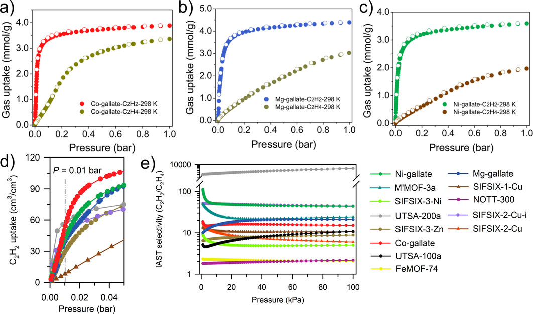 3. IAST选择性测试:298K、1 bar下,Ni、Mg、Co-gallate对1:99混合体系的选择性分别为43.7、20.9、15.0,Ni-gallate在1 kPa时达112。