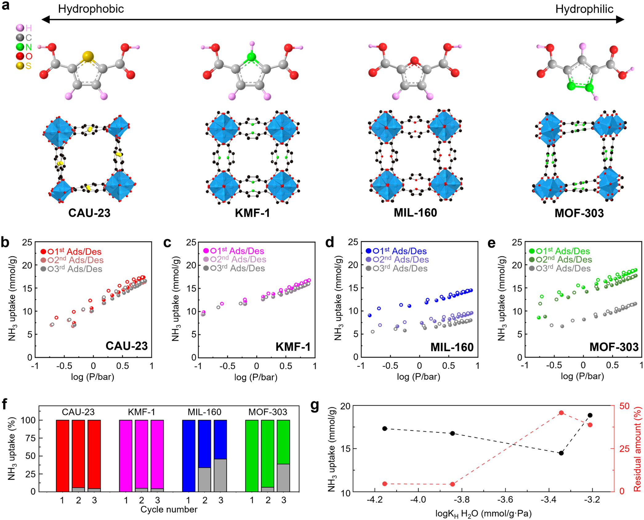 2)发现疏水MOF(CAU-23)的独特4-顺-4-反构型可促进NH₃分子间氢键聚类,无需强宿主-客体相互作用即可实现高容量吸附。