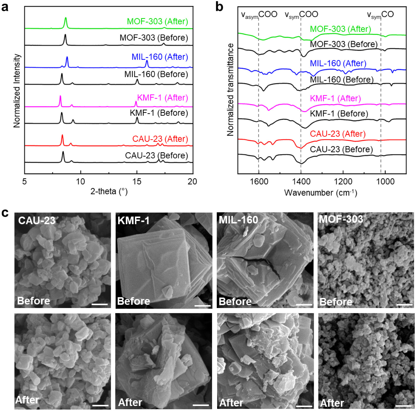 3)FT-IR与XPS:证实配体与金属节点成功配位,CAU-23循环后无明显光谱变化,而亲水MOF出现羧酸盐振动峰分裂或位移,表明结构损伤。