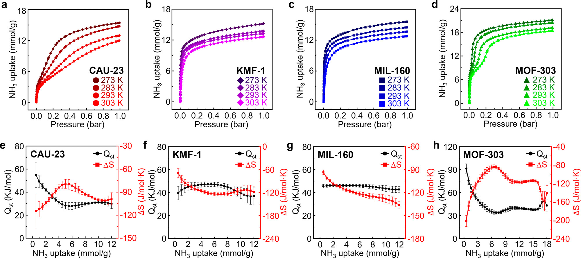 1)高压NH₃吸附:303 K、7 bar下,CAU-23吸附容量17.4 mmol/g(体积容量18.6 mmol/cm³),MOF-303(亲水)为18.5 mmol/g,KMF-1为16.5 mmol/g,MIL-160为14.4 mmol/g。