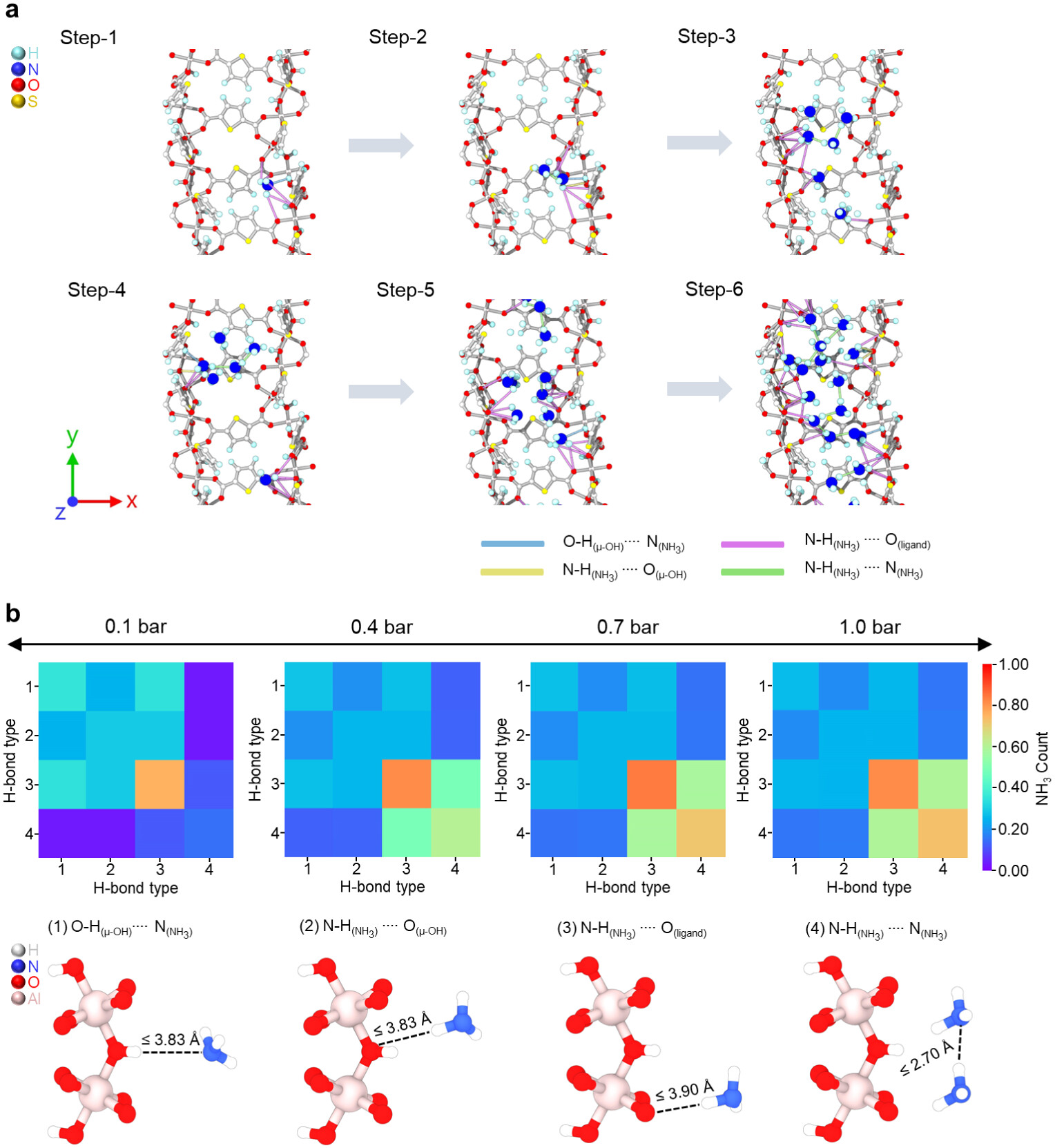 1)吸附机制:GCMC模拟表明,高压下CAU-23的螺旋孔道几何结构促进NH₃分子间氢键形成聚类,而非依赖配体与NH₃的强相互作用,避免了不可逆吸附。