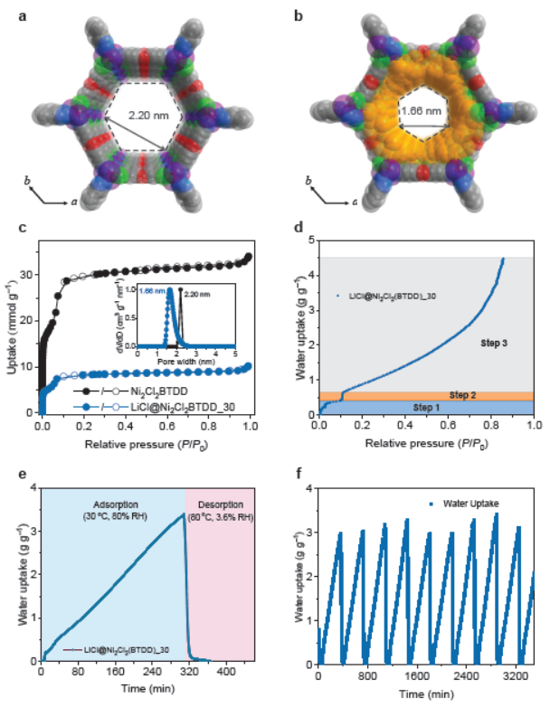 1. 成功构建LiCl@Ni₂Cl₂(BTDD)复合吸附剂,实现3.46 g g⁻¹的高吸附容量与60℃低温解吸的协同优势,循环稳定性优异,无盐泄漏问题。