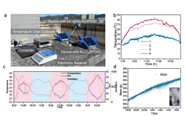 3)实地测试:上海(亚热带湿润气候)、济南(大陆性气候)、昆明(高原亚热带气候)三地测试中,复合体系产水量较纯MOF体系提升46%-91%,昆明冬季60℃驱动温度下仍能高效制水,产水水质符合WHO标准,未检测到Li⁺、Ni²⁺等离子。