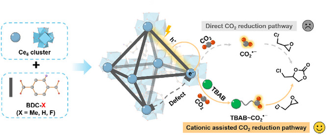中国科学院宁波材料技术与工程研究所杨其浩、陈亮和中国科学技术大学江海龙老师等报道的本篇文章中报道了一系列通过linker工程调控缺陷密度的铈基金属有机框架(Ce-UiO-66-X,X=Me、H、F),并系统阐明其光催化CO₂环加成反应机理。其中,Ce-UiO-66-H因在光吸收与电荷分离之间达到最优平衡,与四丁基溴化铵(TBAB)助催化剂耦合时展现出卓越催化性能(产率>90%)。原位实验与理论计算证实,TBAB通过形成[Br⁻…TBA⁺]·CO₂加合物稳定CO₂,将CO₂⁻生成的热力学能量需求从直接还原路径的0.66 eV降至-0.90 eV,促进光电子从MOF向CO₂高效转移,显著提升环加成反应效率。