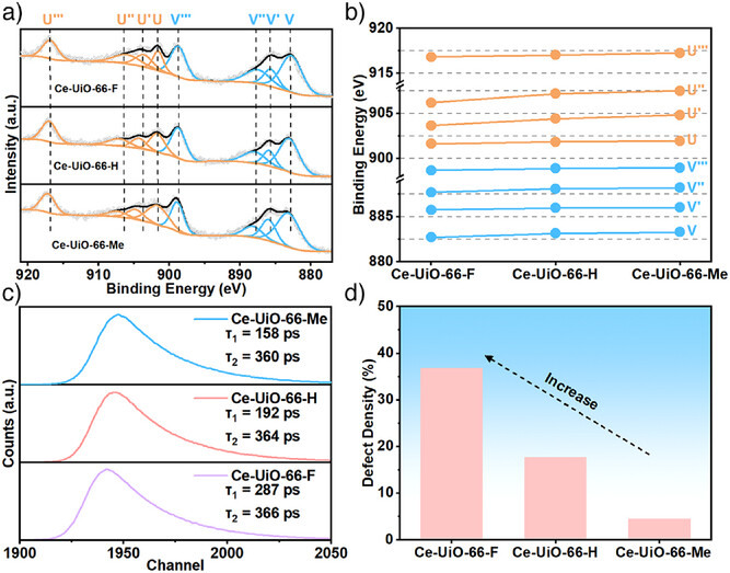 b)缺陷密度表征:X射线光电子能谱(XPS)显示Ce 3d结合能随吸电子取代基强度增加而降低,缺陷密度顺序为Ce-UiO-66-F(37.0%)>Ce-UiO-66-H(17.7%)>Ce-UiO-66-Me(4.5%);正电子湮没寿命谱(PALS)中缺陷敏感的τ₁组分(缺失linker诱导的Ce³⁺-氧空位)寿命与强度趋势一致,佐证linker工程的调控有效性。