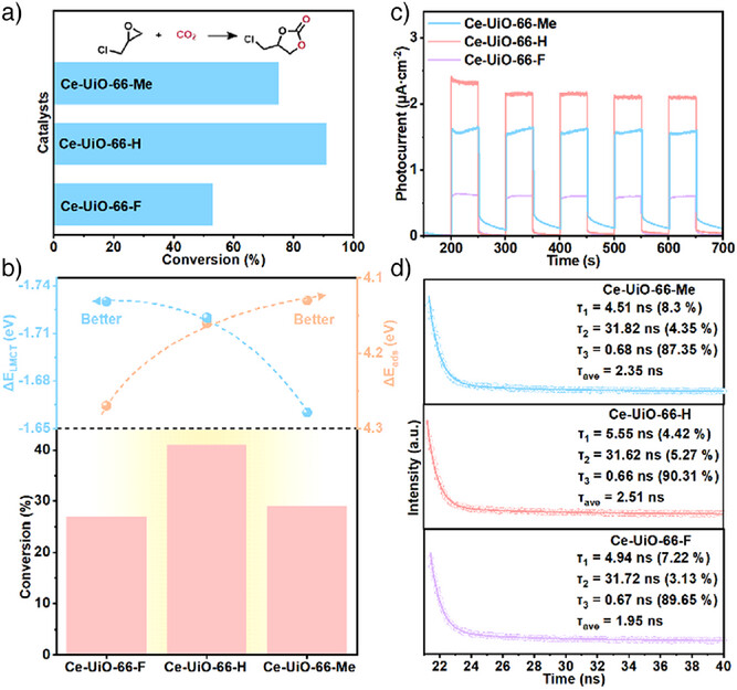 1) 通过linker官能团工程(Me、H、F取代)精准调控Ce-UiO-66的缺陷密度,构建电子结构可调的光催化平台,揭示缺陷密度与光吸收、电荷转移的构效关系。
