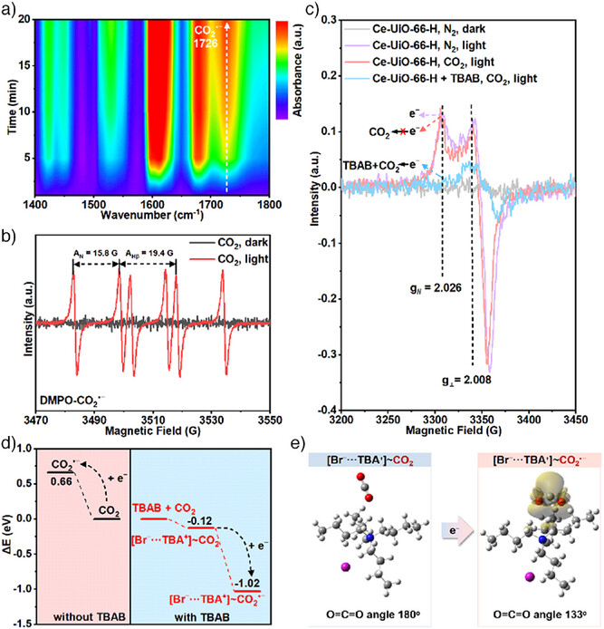 1) 自由基生成:原位漫反射红外光谱(DRIFTS)在1726 cm⁻¹处检测到CO₂⁻特征峰,电子顺磁共振(EPR)证实DMPO-CO₂⁻加合物存在,且仅在Ce-UiO-66-H/TBAB/CO₂/光照体系中出现。