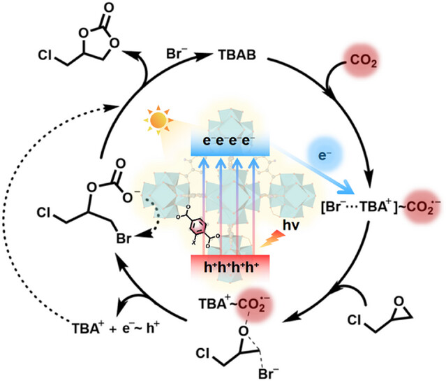 3) 电荷转移路径:光照引发linker光激发,通过LMCT过程将电子转移至Ce-氧节点,随后经TBAB介导传递至[Br⁻…TBA⁺]·CO₂加合物生成CO₂⁻,同时Br⁻打开环氧化物环,CO₂⁻进攻环氧化物亲电碳中心,经分子内环化生成环状碳酸酯,完成催化循环。