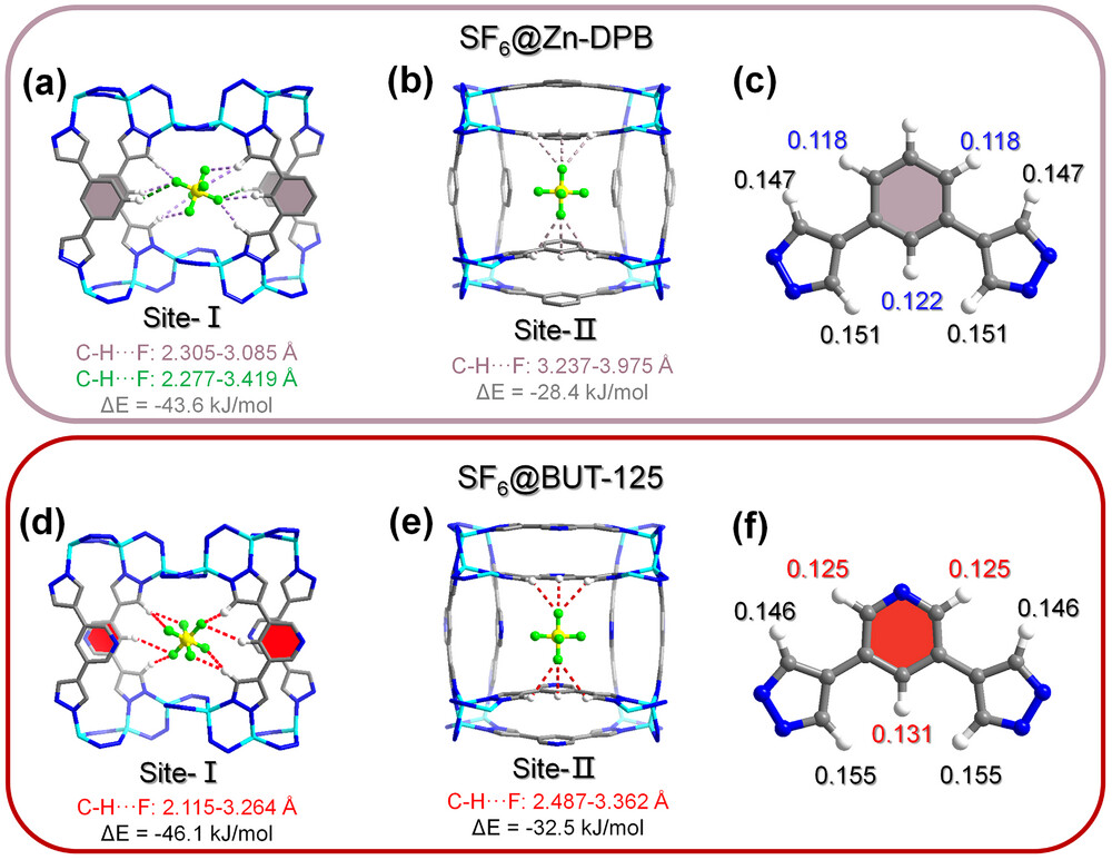 b) 结合能:SF₆在BUT-125的两个吸附位点(Site-I、Site-II)结合能分别为46.1 kJ·mol⁻¹和32.5 kJ·mol⁻¹,均高于Zn-DPB(43.6 kJ·mol⁻¹、28.4 kJ·mol⁻¹)。