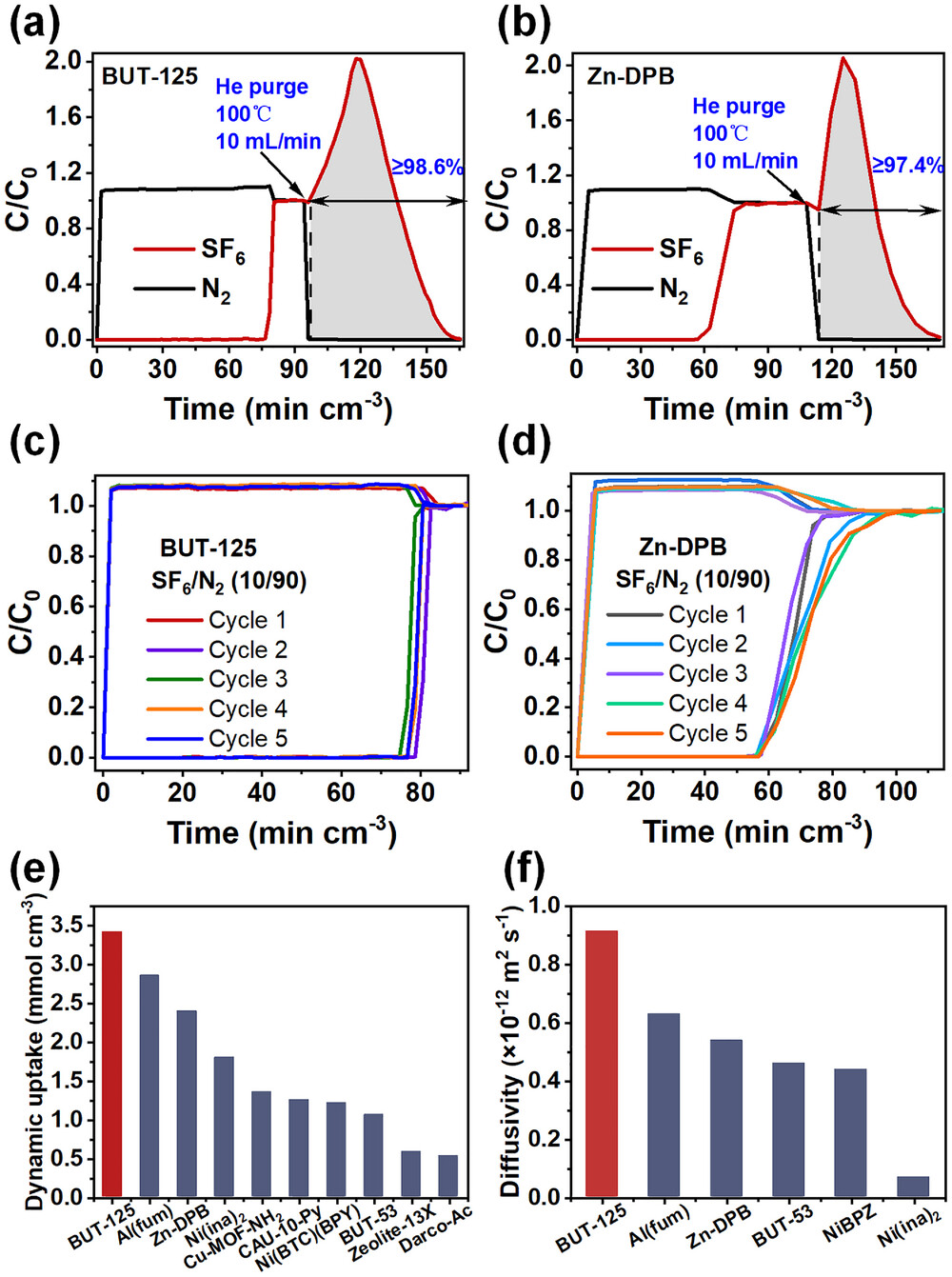 3) 吸附动力学:微孔扩散模型拟合显示,BUT-125的SF₆扩散系数为9.15×10⁻¹³ m²·s⁻¹,远高于Zn-DPB(5.39×10⁻¹³ m²·s⁻¹)及其他基准材料(Al(fum) 6.30×10⁻¹³ m²·s⁻¹、Ni(ina)₂ 0.68×10⁻¹³ m²·s⁻¹)。