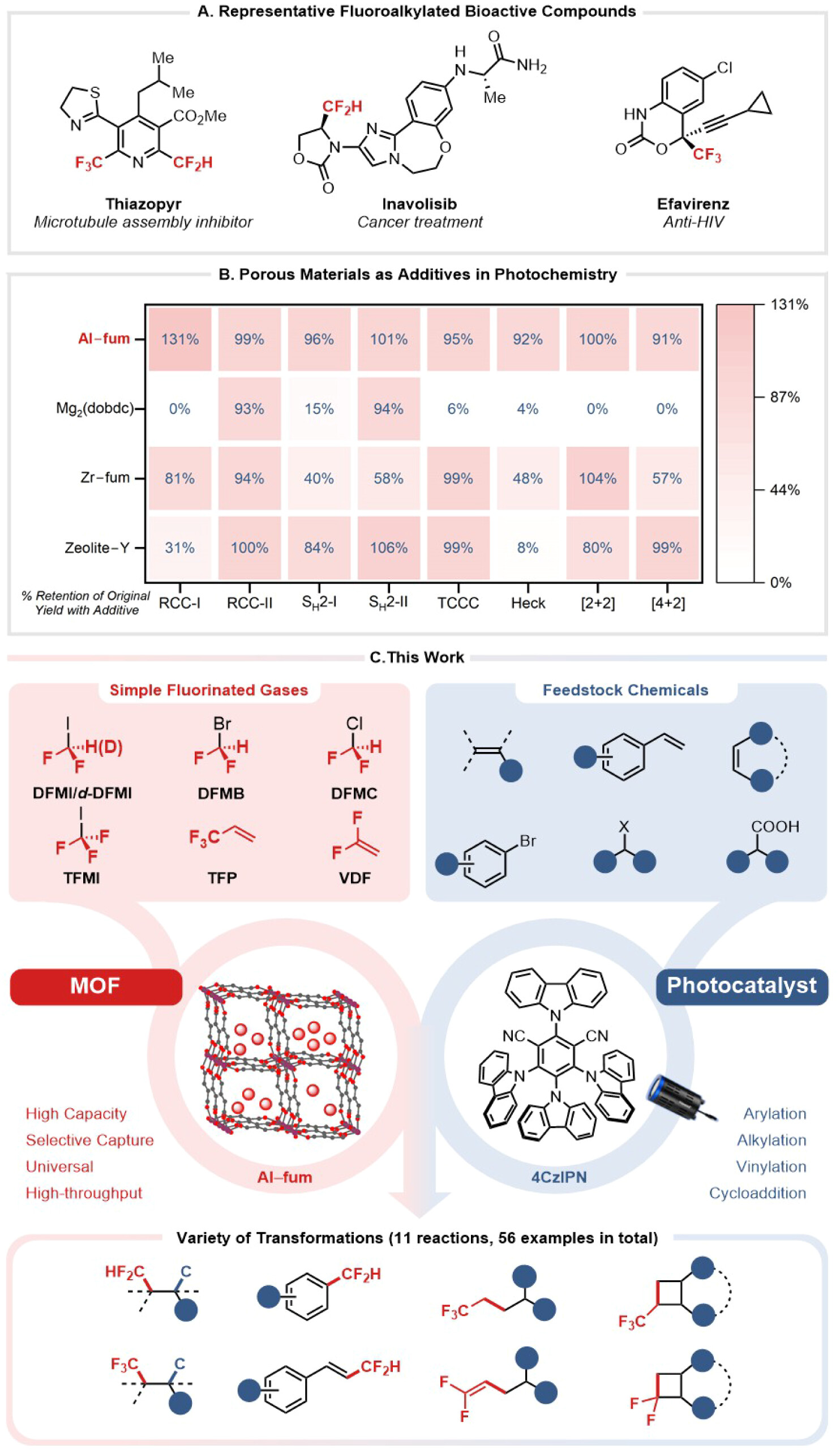 1. 以Al–fum为载体构建含氟气体光化学应用平台,制备7种试剂、开发11种反应,实现未活化烯烃高效转化及生物活性分子后期官能化,解决传统痛点。