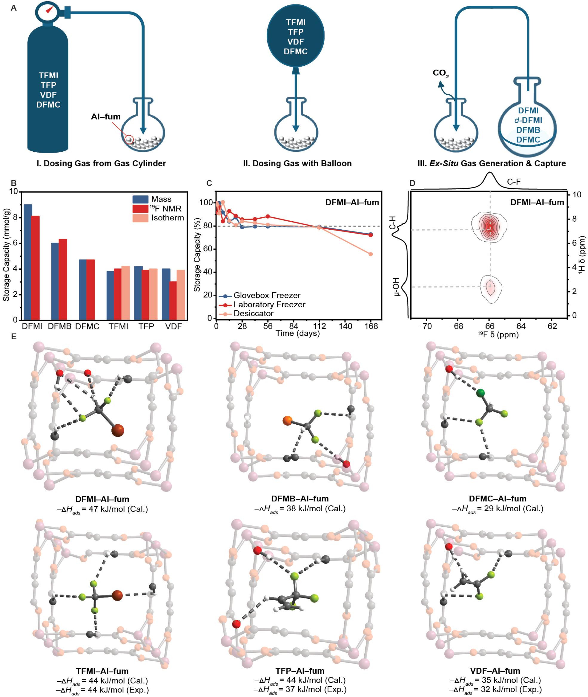 1. 气体储存机理:Al–fum的6 Å窄孔径与含氟气体形成多种氢键,高吸附焓使其可选择性捕获DFMI。