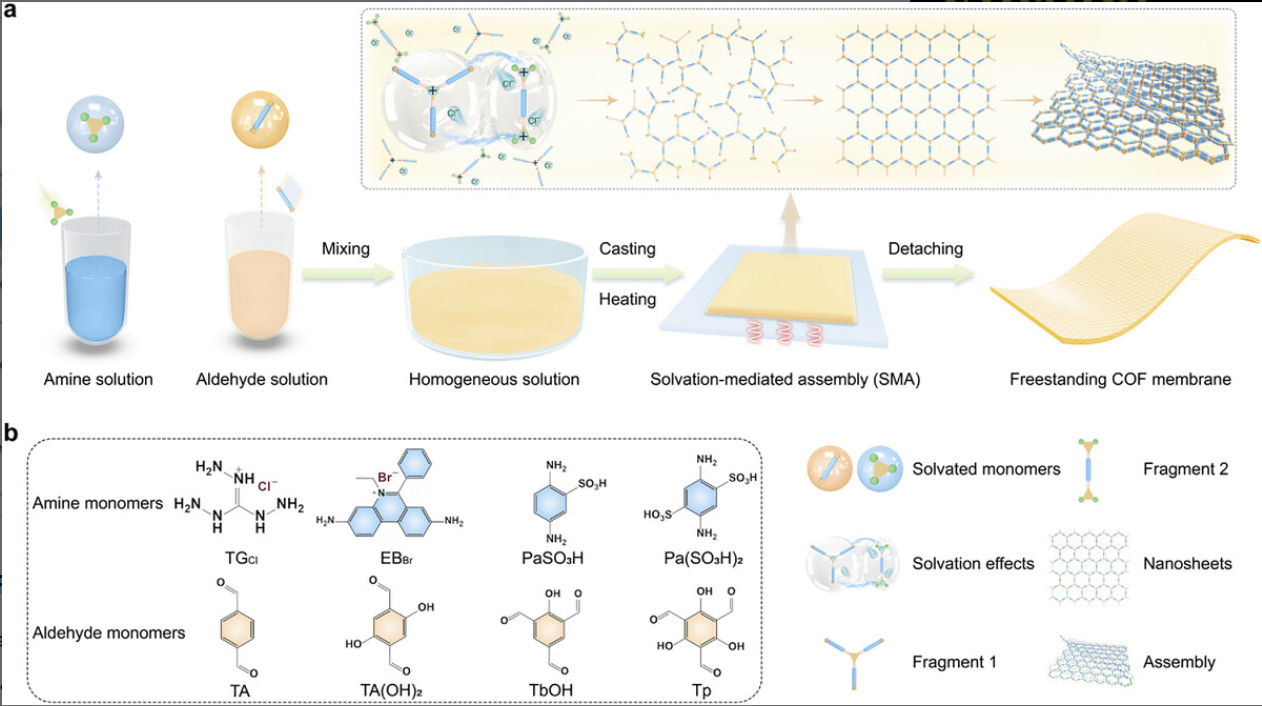 中科大徐铜文、李兴亚课题组发表于Angewandte Chemie International Edition 的研究中,针对COF膜规模化合成难、形成机理不明的痛点,提出溶剂化介导组装(SMA)策略,成功制备出面积约2400 cm²、拉伸强度约65 MPa的大规模自支撑COF膜。通过原位加热液体TEM可视化膜形成过程,结合多尺度模拟阐明溶剂化作用机制,所制备膜在高盐水淡化和稀土离子回收中表现出优异离子分离性能,为其工业化应用奠定基础。