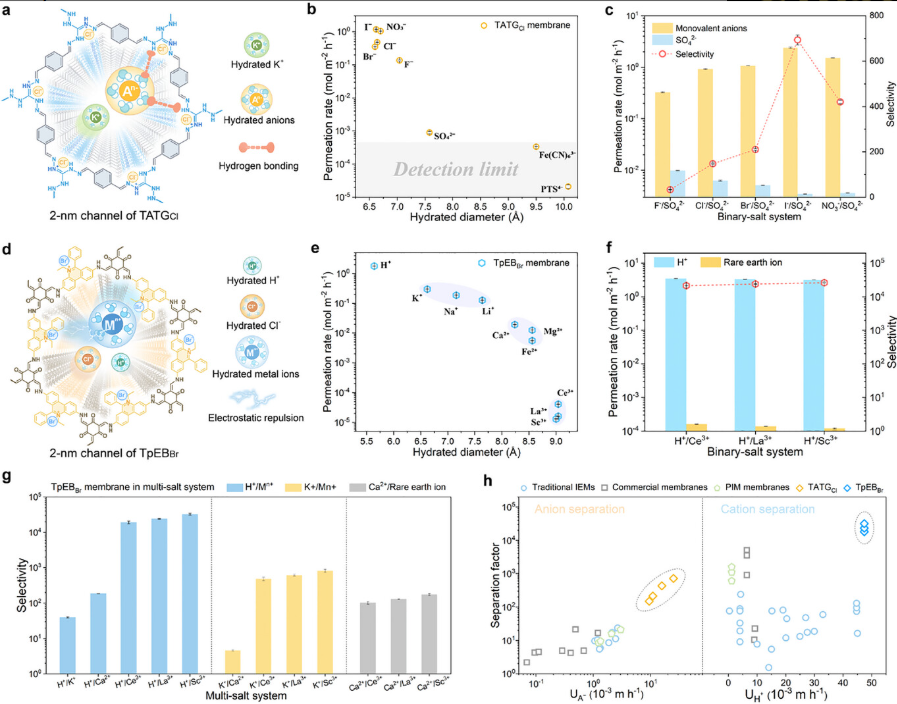 3. 离子分离机理:2 nm级通道提供低能垒传输路径,TATGCl膜通过氢键筛选阴离子,TpEBBr膜通过静电排斥筛选阳离子,实现高效分离。