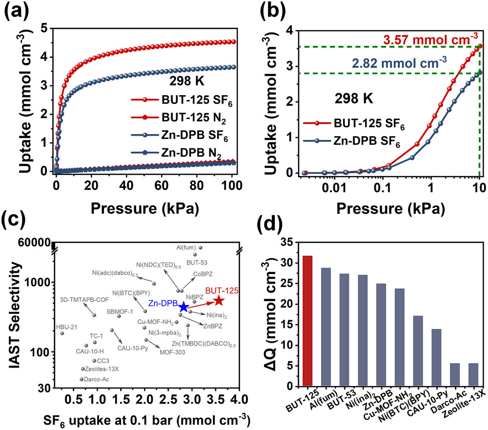 298 K 下,Zn-DPB 在 0.1 bar SF₆吸附量为 2.82 mmol cm⁻³,BUT-125 达3.57 mmol cm⁻³,提升 27%;1 bar 下 BUT-125 吸附量 4.53 mmol cm⁻³,提升 24%,0.1 bar 容量创文献纪录。