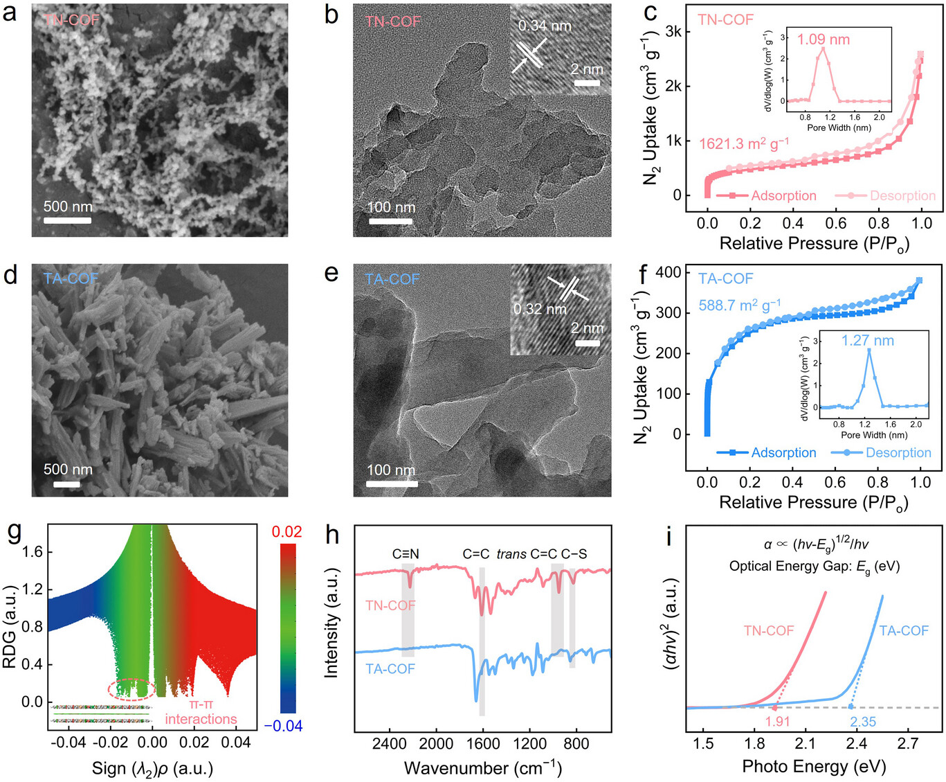 结果:两种材料均为高结晶烯烃连接 COFs,TN-COF 呈纳米颗粒,TA-COF 呈棒状。