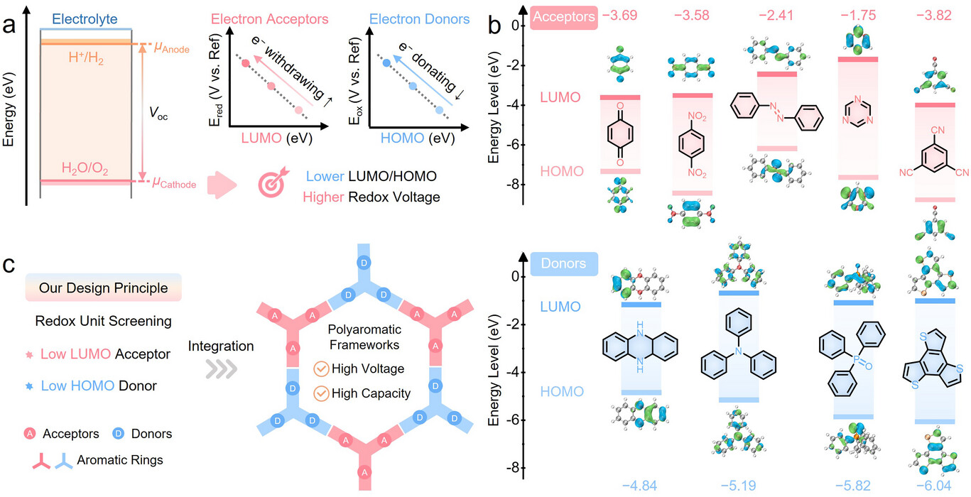 提出低 HOMO/LUMO 给受体配对新策略,成功构筑烯烃连接三 (噻吩 - 腈) COF(TN-COF),精准调控轨道能级,打破容量 - 电压权衡。