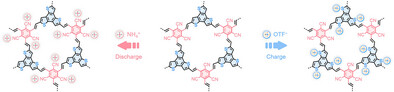 每六元环单元发生18 电子可逆反应:9 个 C≡N 结合 NH₄⁺,9 个 C-S 结合 OTF⁻,对应两步氧化还原。