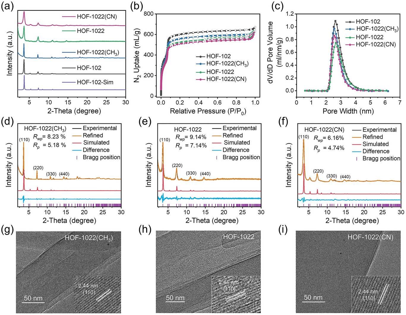 1. 材料合成与结构确认:通过定制化合成OBUs(H4PTBTA及其-CH₃、-CN衍生物),采用“不良溶剂法”成功制备了三种新型HOFs。PXRD精修与HRTEM(晶格间距2.44 nm)证实它们与HOF-102 (点击进入相关产品链接)同构,空间群为C2/m,具有一维方形介孔通道(~2.8 nm)。
